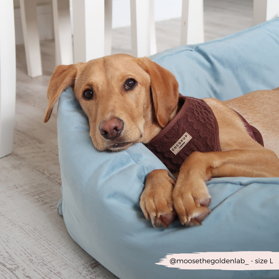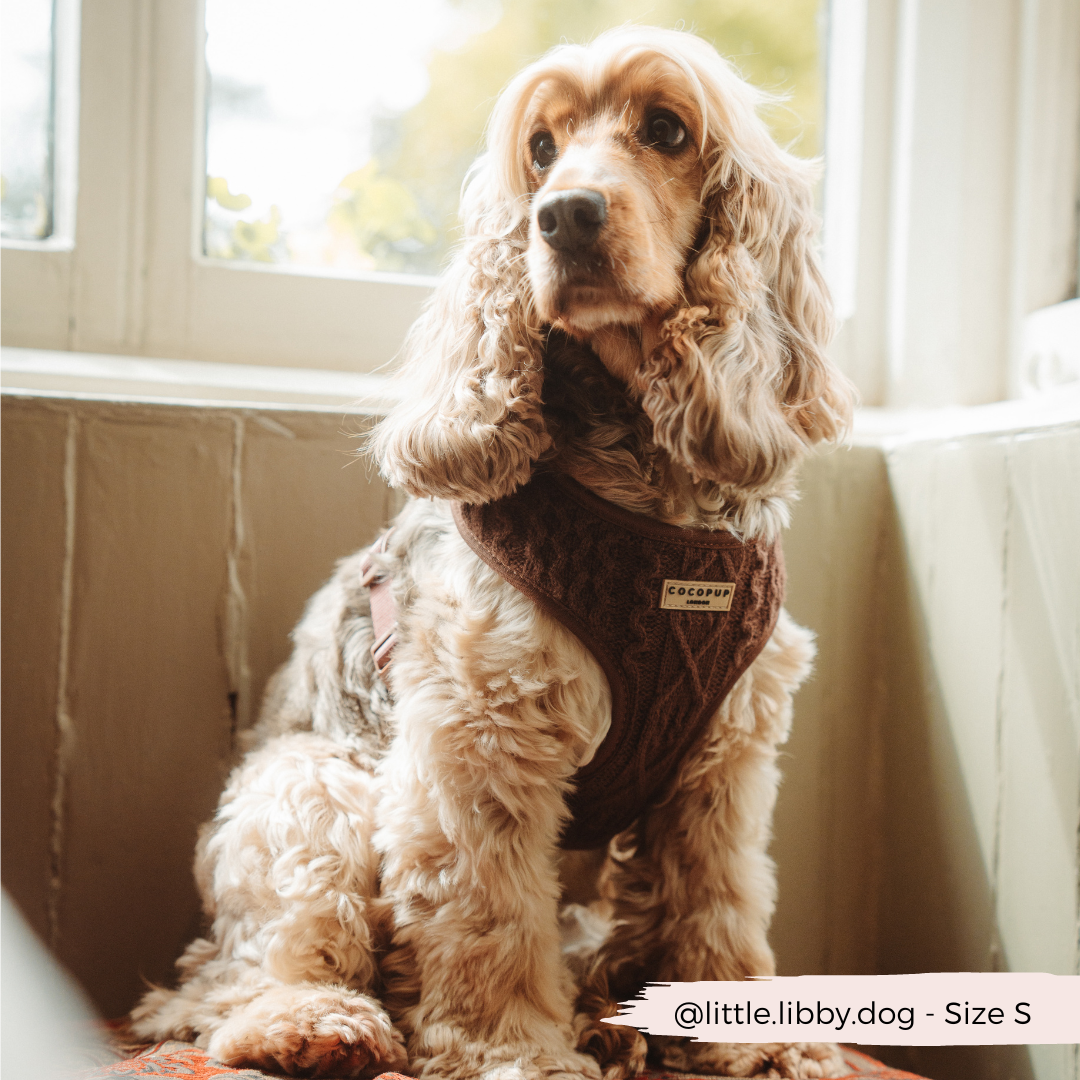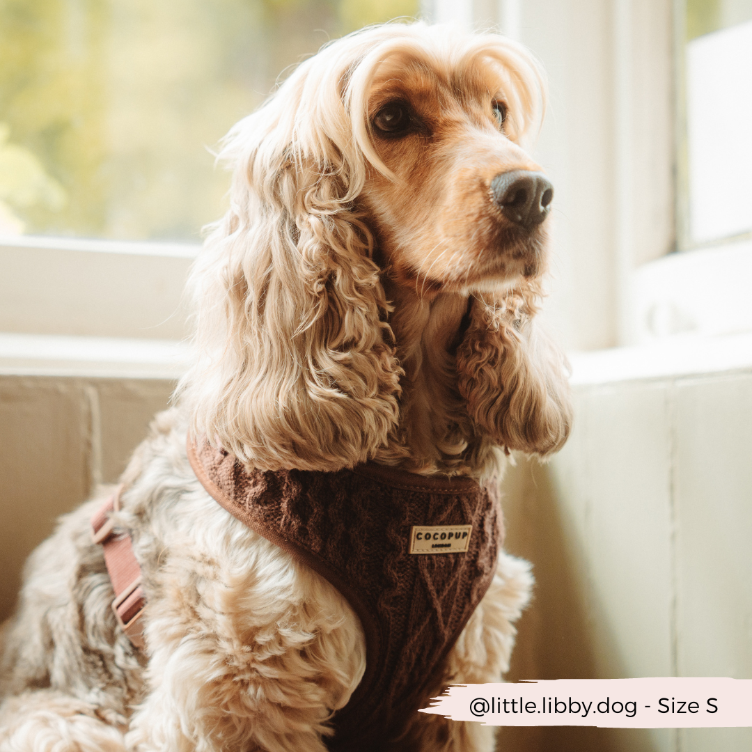 Een cosy look die meteen sfeer brengt. Dit chocoladebruine cable knit hondentuigje voelt warm en zacht aan en geeft je hond een knus en stijlvol uiterlijk tijdens elke wandeling. De gebreide textuur zorgt voor een charmante, winterse uitstraling terwijl het tuigje zelf licht en ademend blijft.