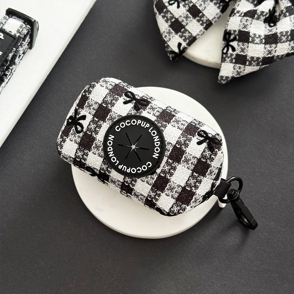 Voeg Parijse flair toe aan je wandeling met dit zwart-wit geruite zakjeshoesje met geborduurde strikjes. Stijlvol én functioneel – perfect bij je andere Cocopup-items.
