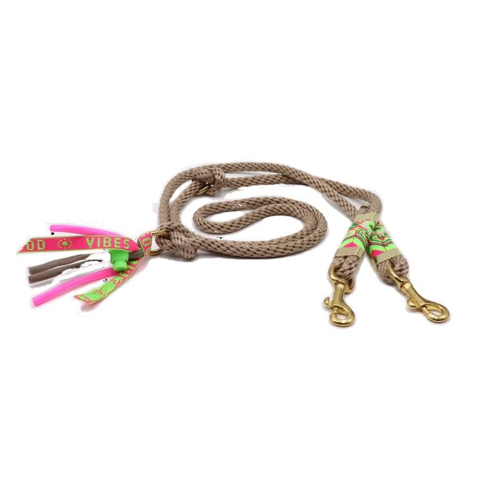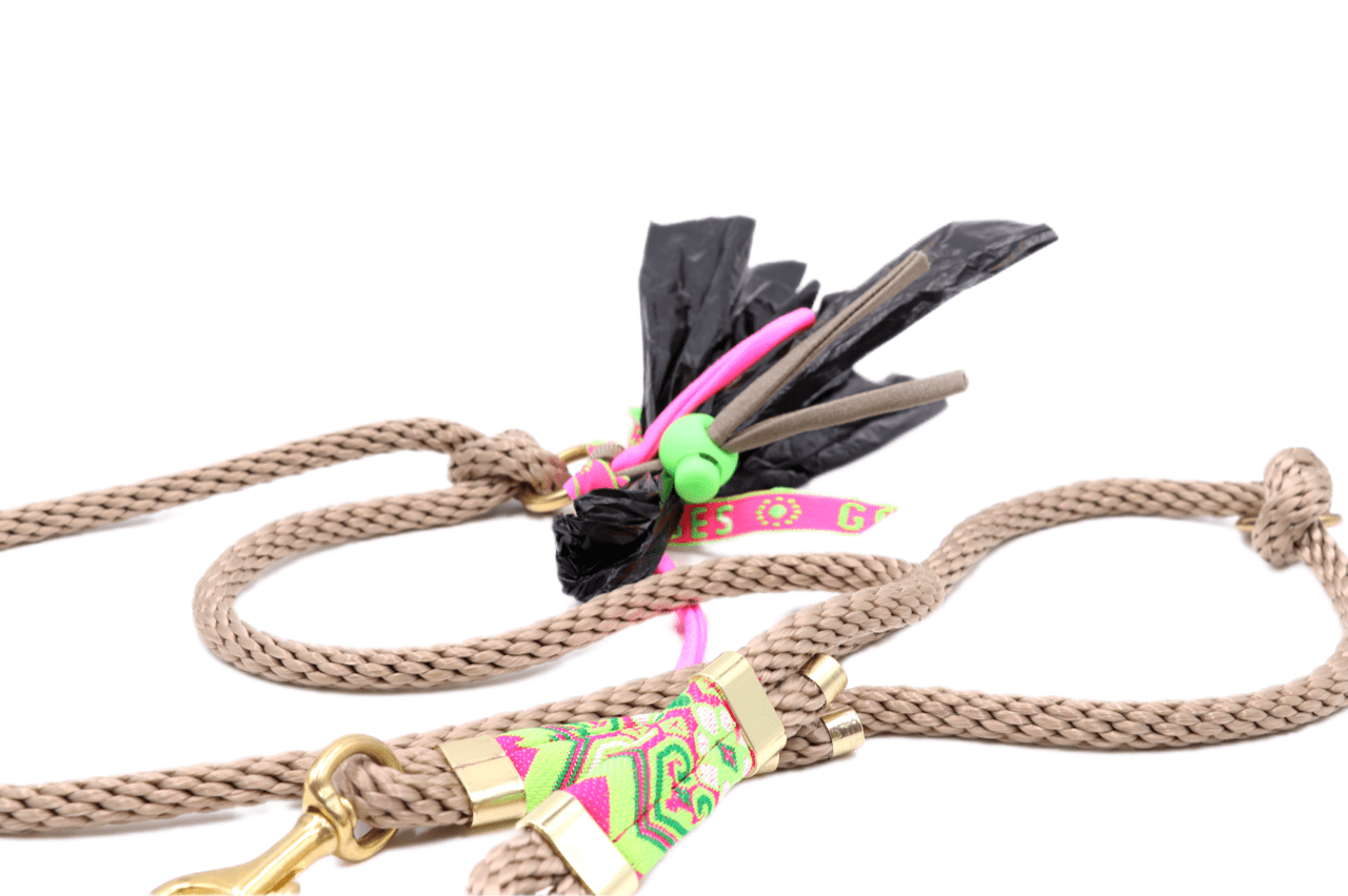 De lijn is gemaakt van glanzend en zeer zacht touw en ligt zeer goed in de hand. Bovendien is hij ultralicht en zelfs in de kleine handtas op te bergen. De lijn heeft een diameter van 8 mm en bij S en M verschillen alleen de karabijnhaken. Door de twee geknoopte ringen kunt u de lijn verstellen, waardoor hij ultra vergrendelbaar is. Verplaats eenvoudig de knoop en u heeft altijd de perfecte instelling voor u. De lijn is in totaal 180 cm lang, net als onze 3-voudige lijnen, maar dan van touw.