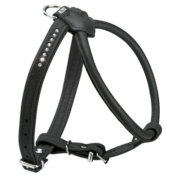 ROUND & SOFT LUXUS ELK PETIT is speciaal voor kleinere honden. Speciaal voor pugs en franse bulldogs, maar over het algemeen voor alle kleine honden, biedt dit lichte, zachte harnas met glanzende strass sieraden de perfecte pasvorm. Het harnas is speciaal ontworpen voor kleinere honden. Verschillende elementen zorgen voor comfort: de slimme pasvorm, die is aangepast aan kleine hondenlichamen, het zachte en soepele scandinavische elandleer en de rond gestikte vorm die bijzonder comfortabel is om te dragen en zeer zacht is. Dankzij een nylon inzetstuk in het rond gestikte elandleer blijft het harnas ondanks zijn delicate en lichte vorm zeer stabiel. De stevig geïntegreerde steentjes bovenop zorgen voor een vleugje luxe.